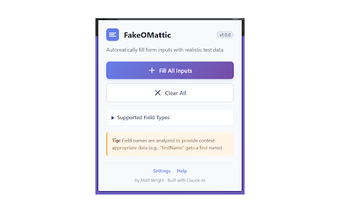 FakeOMattic is een handige browser-extensie voor Chrome die gebruikers in staat stelt om formulieren automatisch te vullen met realistische testgegevens. Deze tool is ideaal voor ontwikkelaars en QA-testers die snel en efficiënt formulieren willen testen zonder handmatig gegevens in te voeren. De extensie biedt een gebruiksvriendelijke interface en stelt gebruikers in staat om verschillende soorten gegevens in te vullen, zoals namen, adressen en e-mailadressen.